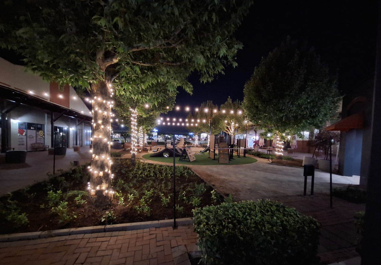 Two kiosks have been placed at the entrance to the square to further add vibrance to the area. The use of fairy lights to the trees and carnival lights over the square creates for a welcome and festive vibe come sunset…